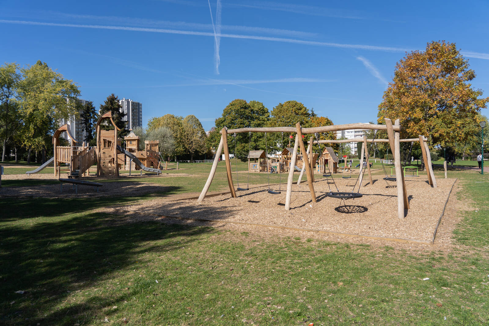 De plus, la construction de cette aire de jeux redynamise le parc urbain. En offrant de nouveaux équipements de jeu, elle encourage les résidents à venir plus souvent au parc et à profiter de ses autres installations, telles que les aires de pique-nique, les sentiers de randonnée et les espaces verts. Cela contribue à renforcer les liens communautaires en rassemblant les gens autour d'un lieu de loisirs et de divertissement commun.